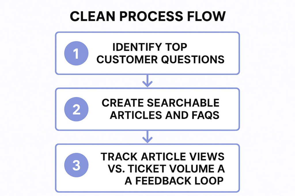 Instead, you should deploy fast with five to 10 articles that answer your most frequent concerns. MatrixFlows says, “Better to start with 5-10 articles addressing real questions. Don’t wait months building theoretical documentation”.